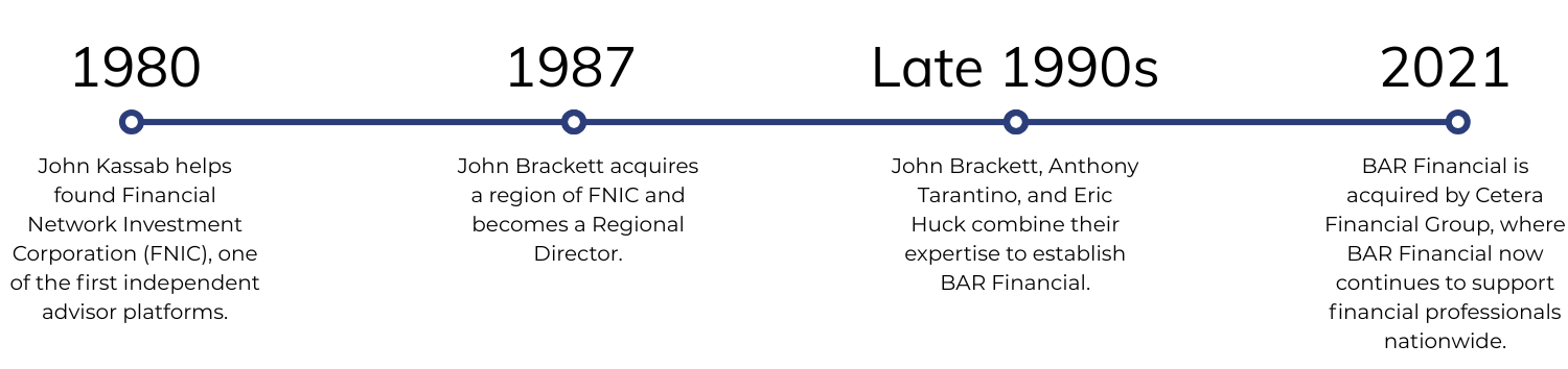 BAR Financial’s roots trace back to the founding of Financial Network Investment Corporation (FNIC), one of the early pioneers of the independent advisor model. John Kassab, grandfather of BAR Financial’s current Chief Marketing Officer, Brianna Romanoff, was one of FNIC’s original founders. BAR Financial Founder, John Brackett, began his career as an early representative at FNIC. He later became a Regional Director, acquiring one of the network’s regions in 1987.